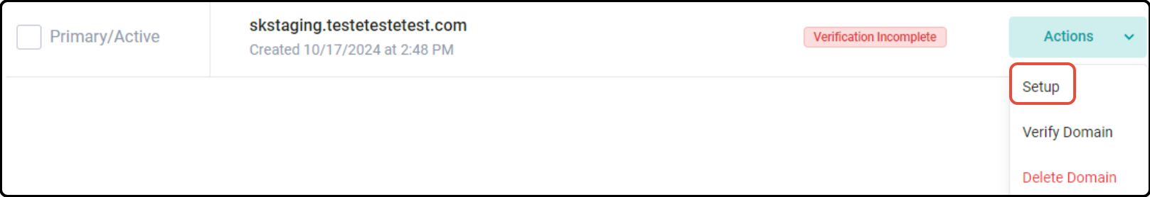To proceed with the setup, please click on the actions dropdown menu next to your domain and click Setup.