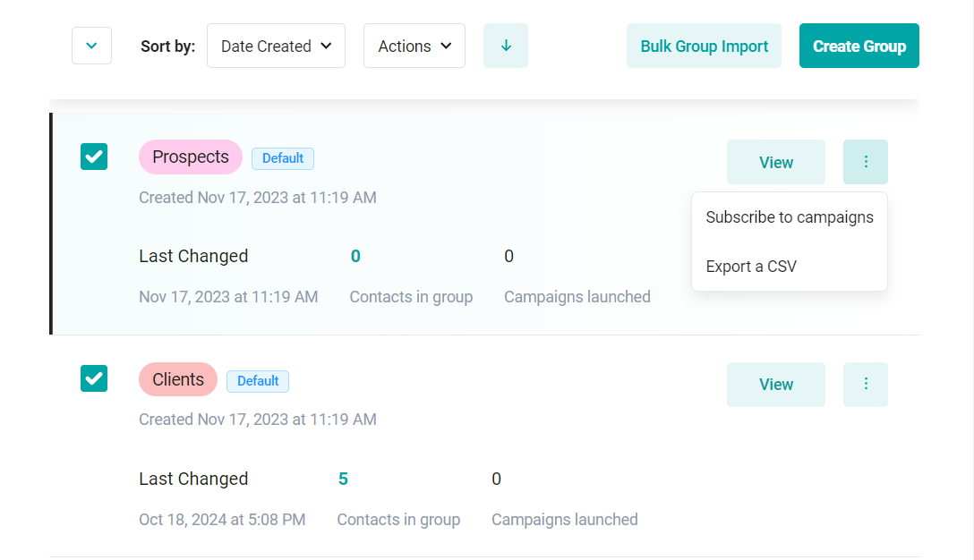 You can also choose to subscribe the group to a campaign or export the list of its contacts.