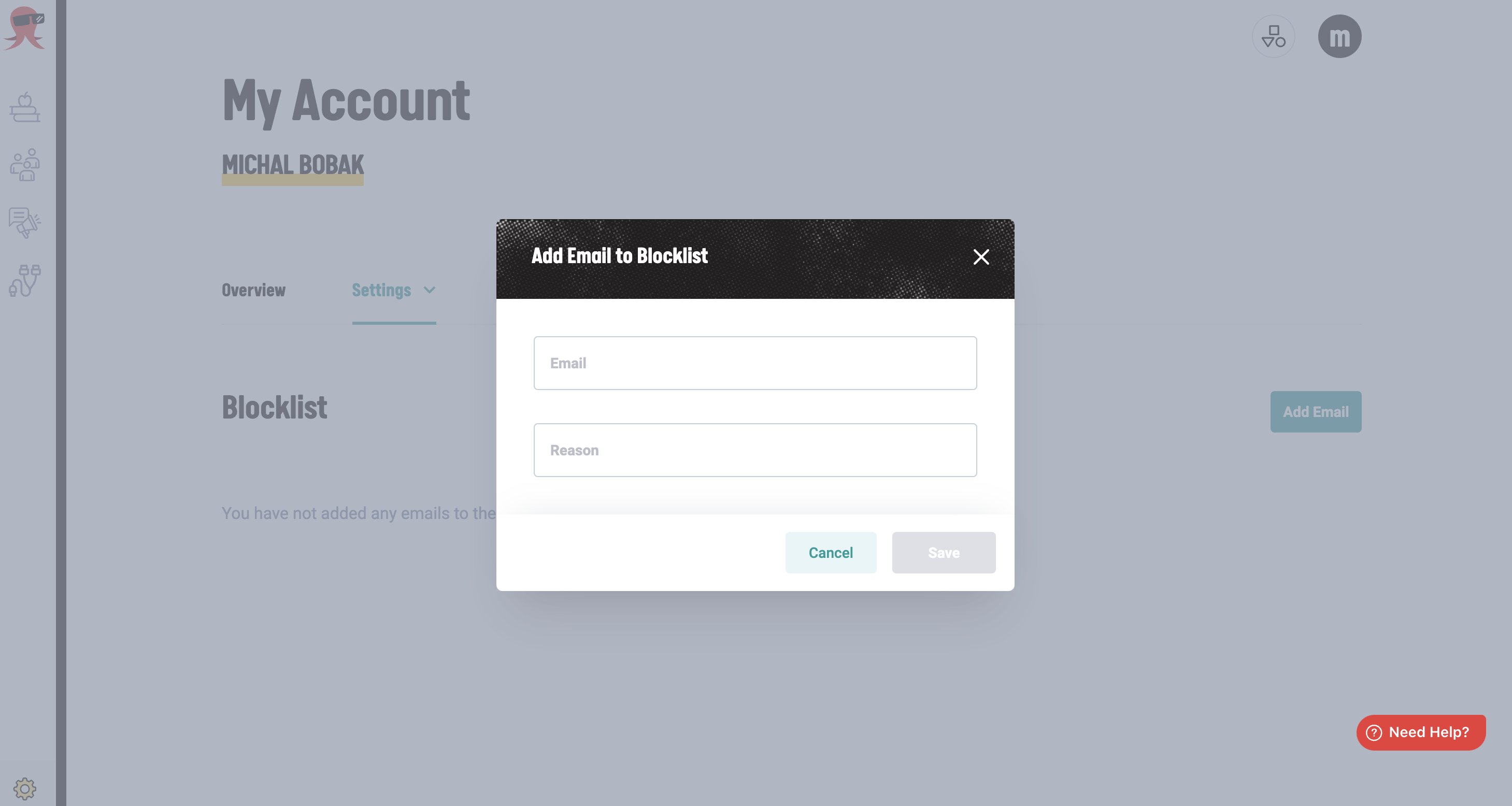 - Enter the email address you want to blocklist, and provide a reason for blocklisting it (e.g., spam complaint, unsubscribed, etc.) for your reference.