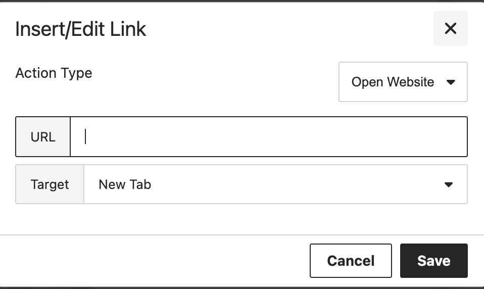 - This opens a window that allows you to add your URL. You don't need to enter a title, but we do recommend changing the "Open link In" from "Current Window" to "New Window."