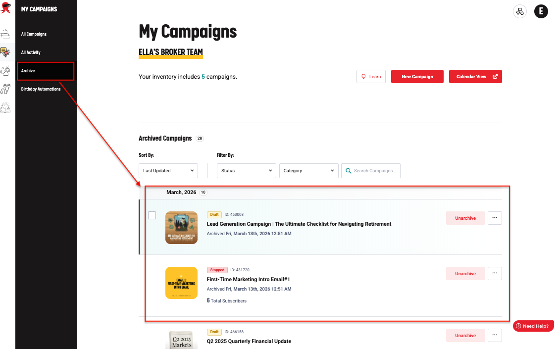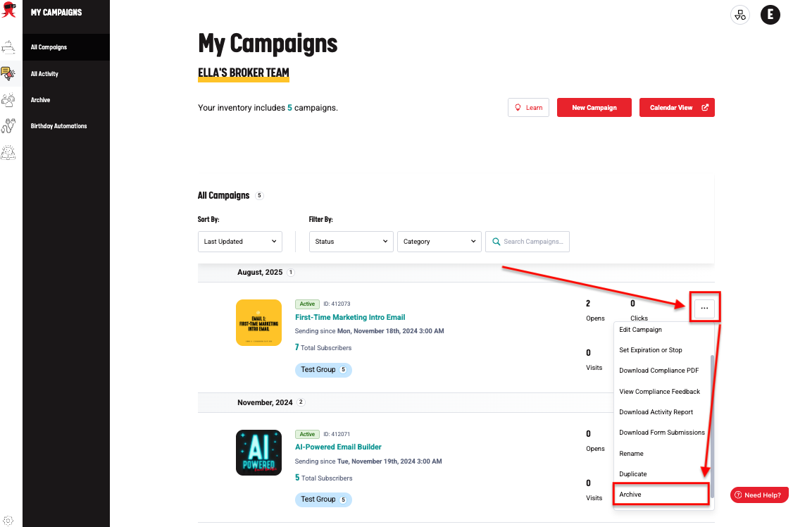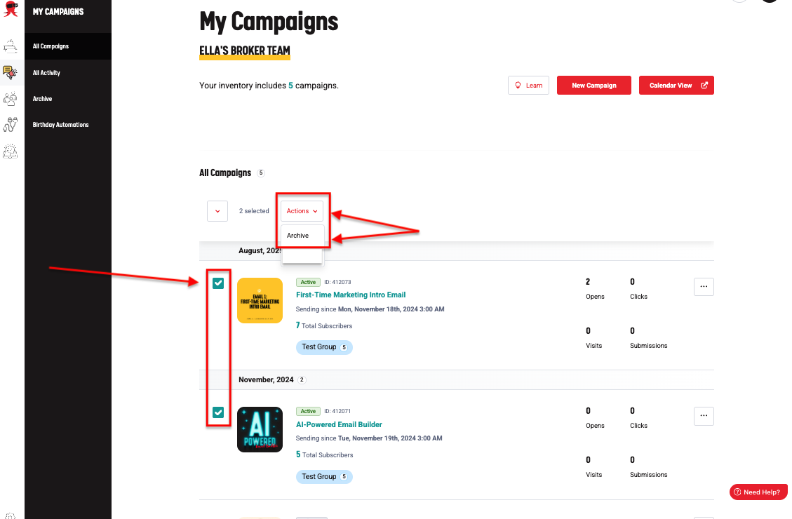 - After selecting the campaign(s), click the Archive option in the action menu. Confirm the action when prompted.