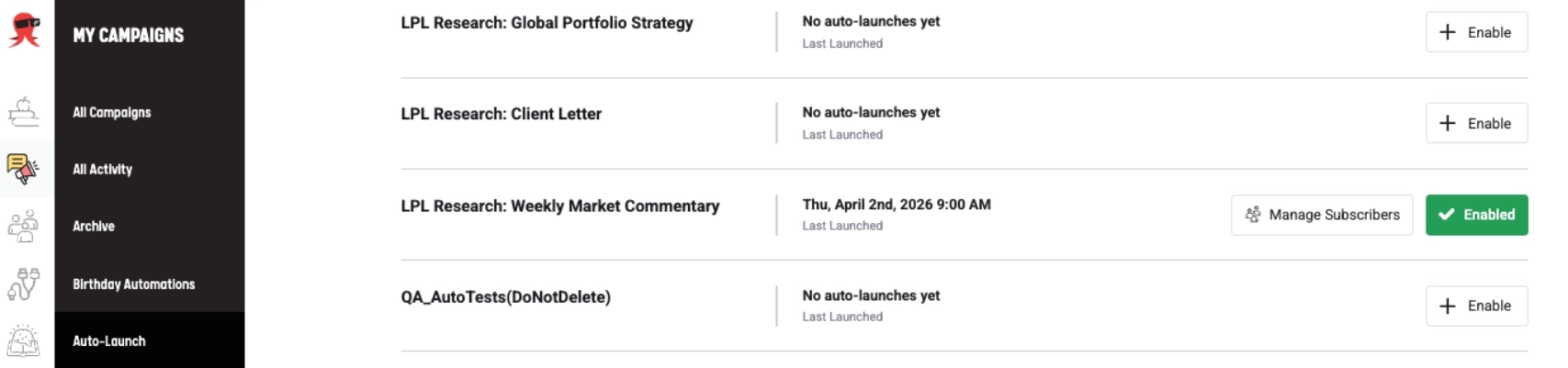 The LPL Research Auto-Launch feature helps you automatically share newly published LPL research content with the right contacts, without rebuilding a campaign every time.